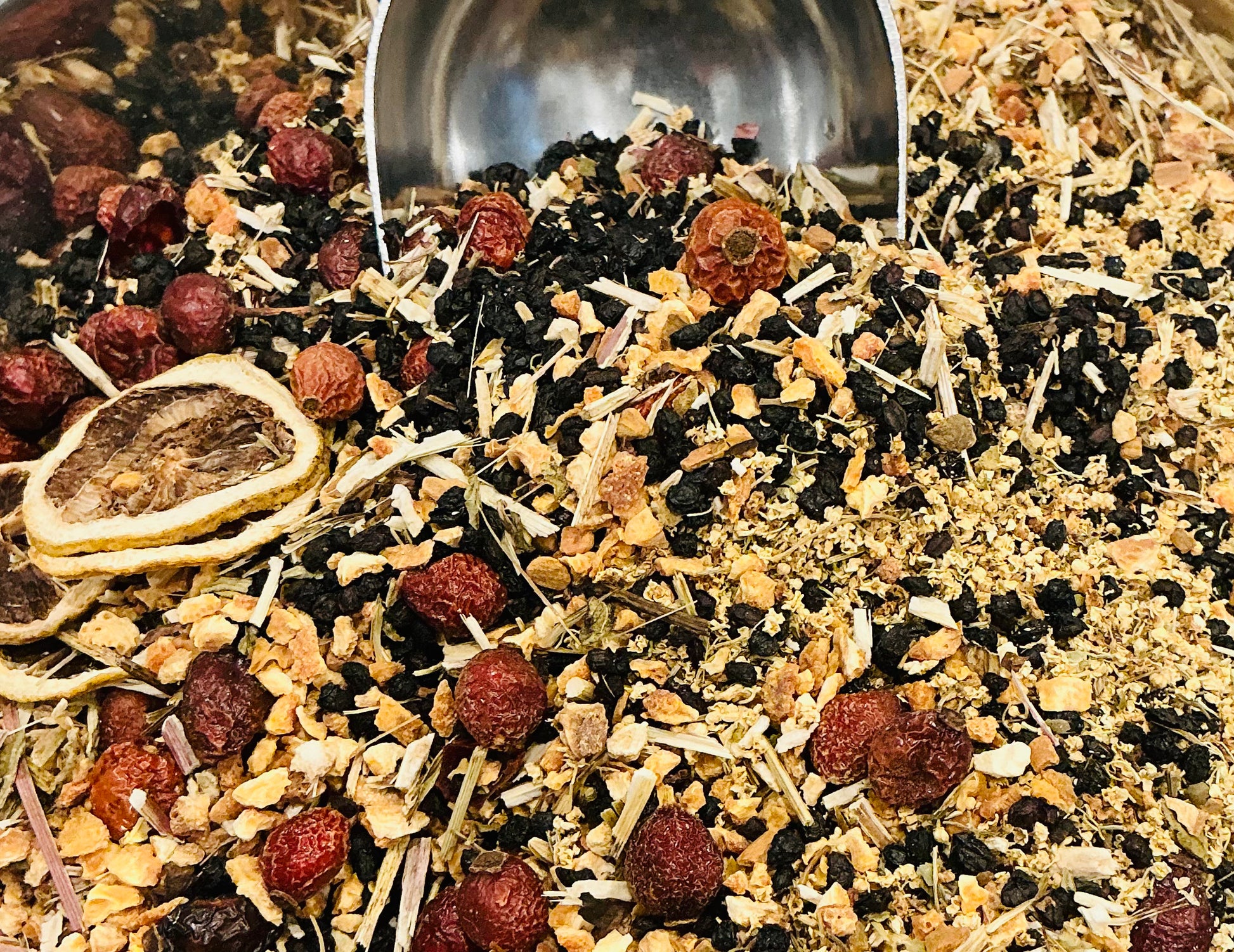 Blend of organic whole elderberry seed, chamomile, cinnamon, and other organic herbs and spices along with instructions to make elderberry syrup.